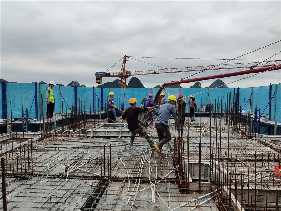 馬達聲、電鉆聲轟鳴,混凝土攪拌車、混凝土泵車、材料運輸板車、土方綠皮車來往穿梭,綁扎鋼筋、混凝土塌落度試驗、澆筑混凝土、升爬架前驗收等工作有條不紊進行,這是第四分公司融創(chuàng)江南林語項目的趕工現(xiàn)場。