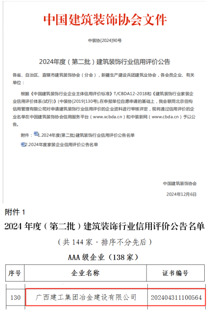 12月6日,中國建筑裝飾協(xié)會(huì)發(fā)布2024年度(第二批)建筑裝飾行業(yè)信用評(píng)價(jià)公告,冶建公司獲評(píng)為“建筑裝飾行業(yè)信用AAA企業(yè)”。這是公司連續(xù)12年獲此殊榮。