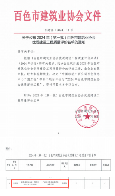 【喜訊】冶建桂鴻分公司項(xiàng)目獲評(píng)為百色市優(yōu)質(zhì)工程