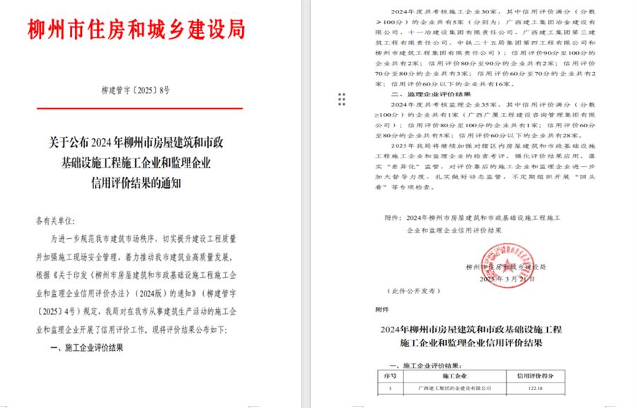 近日,柳州市住房和城鄉(xiāng)建設局發(fā)布《關于公布2024年柳州市房屋建筑和市政基礎設施工程施工企業(yè)和監(jiān)理企業(yè)信用評價結果的通知》(柳建管字〔2025〕8號),冶建公司以122.18分的優(yōu)異成績,位列柳州市施工企業(yè)信用評價榜首,彰顯了公司在工程質量、安全管理及市場信譽等方面的卓越實力。