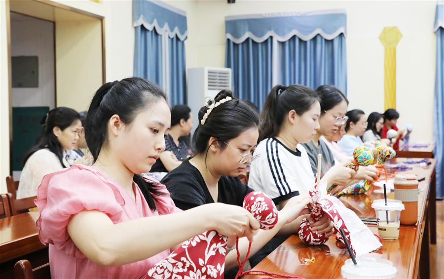 課堂上,培訓老師王春梅為大家詳細講解了艾草養(yǎng)生錘的功效和用途,并演示了其制作方法和步驟。“將錘柄插入艾草包,拉緊艾草包,然后將其放在布料三分之一處,捏成一個緊實的圓球……”在王老師的指導下,女職工們積極參與,跟著老師的指導一步一步地制作自己的養(yǎng)生艾草錘。大家認真細致的聽講并按步驟制作,不久一把把色彩鮮艷、質量上乘的艾草養(yǎng)生錘相繼“出爐”。大家互相試用,現(xiàn)場洋溢著歡聲笑語。
